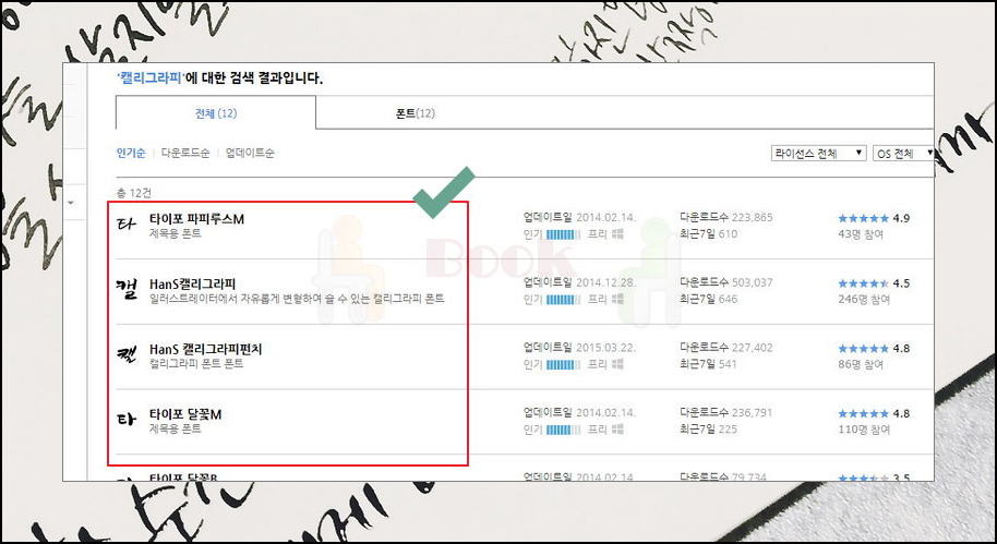 여러 가지 캘리그라피 폰트가 나타났어요. 대부분 무료로 사용할 수 있는 폰트에요. 일러스트레이터에서 자유롭게 변형하여 쓸 수 있는 폰트도 있으니 함께 사용해 보세요. 평점도 높고, 다운로드 횟수도 많아서 믿고 사용할 수 있어요.
