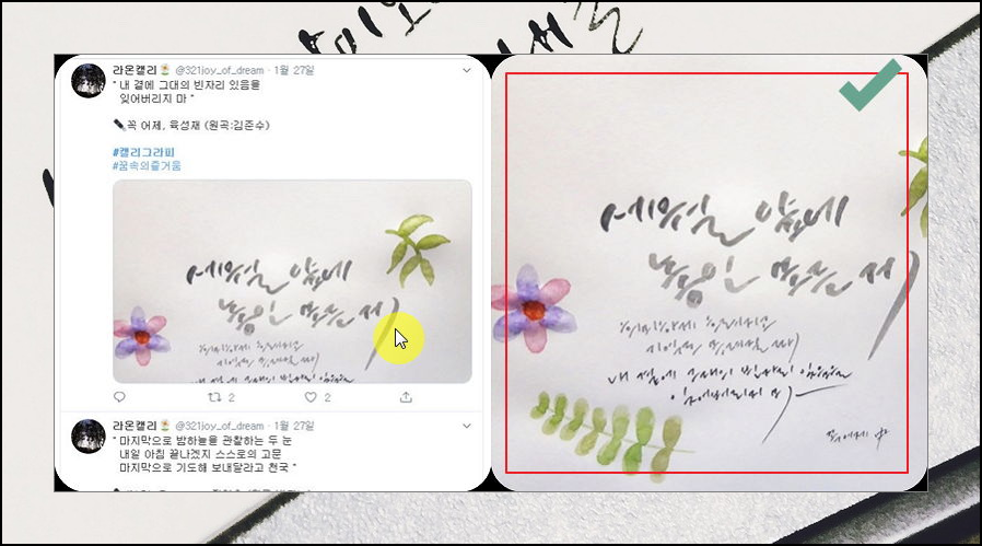 검색 결과에서 볼 수 있듯이 무수히 많은 캘리그라피 글귀모음이 나타나요. 인기순, 최신순으로 리스트 정렬을 할 수 있어요. 메뉴에서 사진을 클릭해 보세요. 그럼 전용 이미지만 나타나게 할 수 있어요. 보시면 아시겠지만, 트위터에 자료가 엄청 많아요. 리스트에 나온 글귀모음에서 마음에 드는 작품을 찾아보세요.