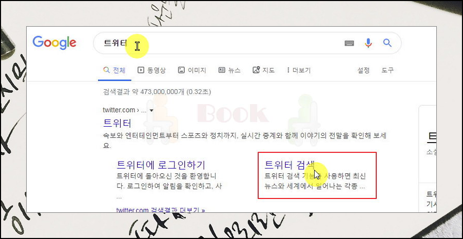트위터를 이용하면 많은 캘리그라피 글귀모음을 찾아볼 수 있어요. 자료가 워낙 방대해서 웬만한 모음보다 많이 찾아볼 수 있는데요. 트위터를 이용하지 않는 분들은 조금 꺼리실 수 있어요. 걱정하지 마세요. 회원 가입을 하지 않아도 자료를 찾아보고 다운 받을 수 있어요. 이용하는 방법도 정말 쉽고요. 구글에서 '트위터 검색' 페이지로 접속해 주세요.