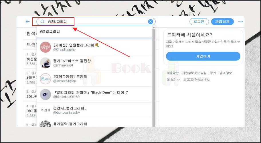 트위터 홈페이지에 접속했어요. 좌측 상단에 검색창이 있는데요. 여기에 샵(#)과 함께 캘리그라피를 입력한 후 엔터키를 눌러주세요.