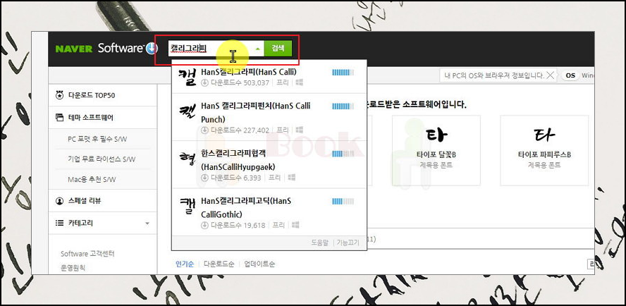 네이버 소프트웨어 사이트에 접속했어요. 홈페이지 상단에 있는 검색창에 '캘리그라피'를 입력한 후 검색 버튼을 눌러보세요.