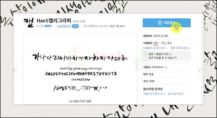 마음에 드는 HanS 캘리그라피 폰트를 클릭해 보았어요. 네이버 소프트웨어 사이트에서 한글 붓 글씨체 부문 2위를 달성한 자료에요. 사용 범위를 보면 '프리'라고 나와 있듯이 무료로 사용할 수 있어요. 다운 받은 자료를 실행하면 설치가 진행돼요.