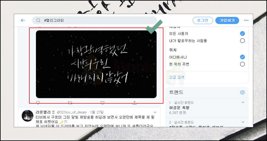 검색 결과에서 볼 수 있듯이 무수히 많은 캘리그라피 글귀모음이 나타나요. 인기순, 최신순으로 리스트 정렬을 할 수 있어요. 메뉴에서 사진을 클릭해 보세요. 그럼 전용 이미지만 나타나게 할 수 있어요. 보시면 아시겠지만, 트위터에 자료가 엄청 많아요. 리스트에 나온 글귀모음에서 마음에 드는 작품을 찾아보세요.