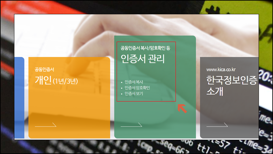 2. 한국정보인증 사이트를 둘러봐요. 한국정보인증 사이트에서는 공동인증서에 대한 발급이나 복사, 암호확인 등 여러 가지 서비스를 제공하고 있는데요. 휴대폰에 등록하려면 첫 화면에서 "관리" 메뉴를 선택하면 됩니다.