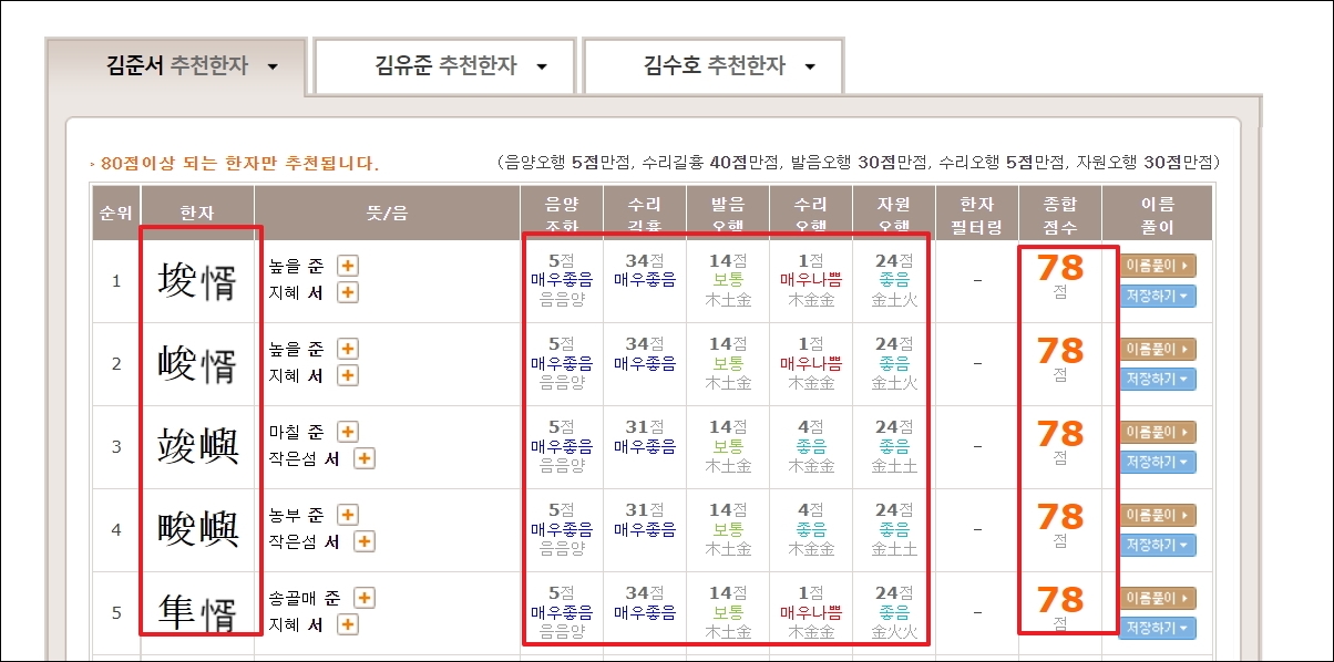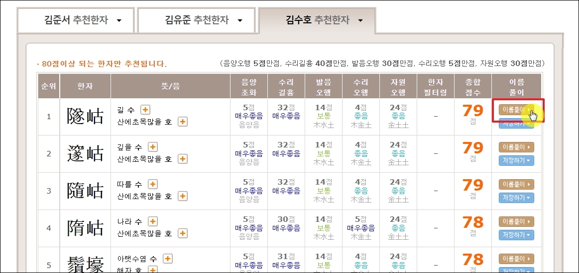 ▼제가 선택한 이름에 맞는 한자 찾기 결과가 나왔습니다. 뜻과 성명학 이론에 근거한 평가를 참고하여 선택하면 됩니다. 이름 풀이 버튼을 클릭하면 감명인증서를 확인할 수 있습니다.