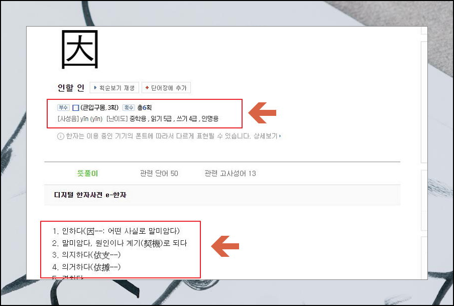 '인할 인'을 검색한 결과가 나타났어요. 해당 문자에 대해 자세히 알아보는 것은 물론이고, 관련 단어, 본문, 부수, 모양자, 고사성어, 숙어를 찾기 가능해요.