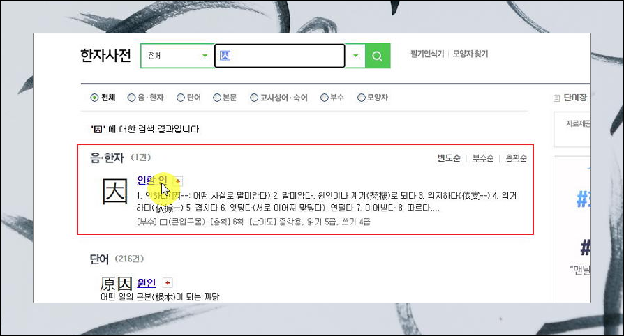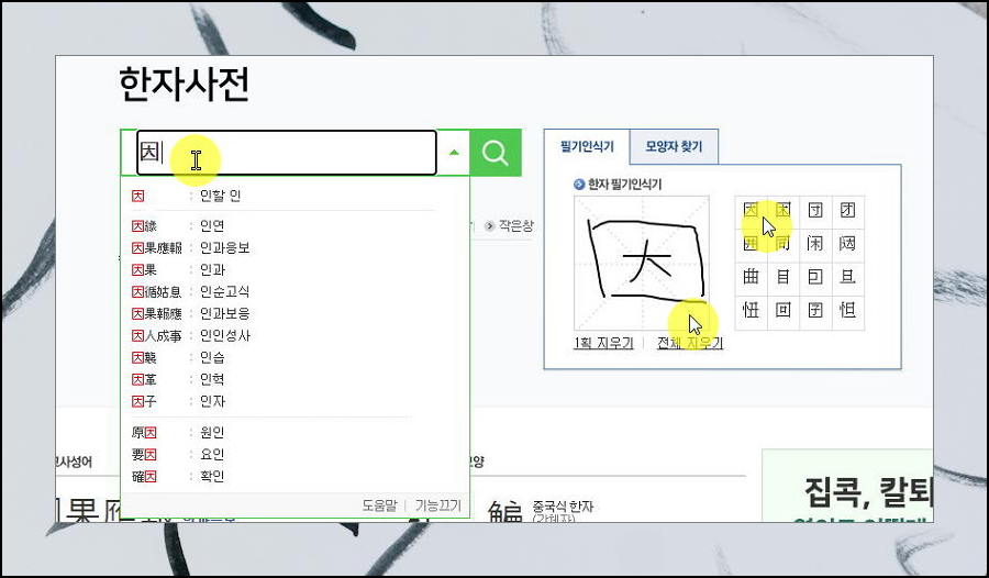 저는 '인할 인'이라는 한자를 그려보았는데요. 문자를 다 그린 후 옆에 있는 선택지에서 첫 번째 것을 마우스로 클릭해 보았어요. 그 결과 검색창에 '인할 인'이 입력되었는데요. 이 상태에서 돋보기 버튼을 클릭하면 관련 사전적 정보를 살펴볼 수 있어요.