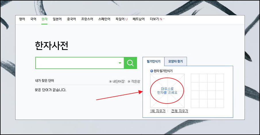 네이버 한문사전 사이트에 접속했어요. 검색창 옆에 보면 필기 인식기가 있는데요. 해당 기능을 이용하면 쉽게 한자 써서 찾기 가능해요. 마우스로 뜻이나 음을 알고 싶은 문자를 필기 인식기에 그려보세요.