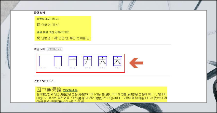 관련 한자와 단어 찾기도 가능한데요. 써서 한자를 암기하고 싶은 경우에는 획순 보기를 참고해 보세요. 정해진 순서에 따라 쓰기 연습을 할 수 있어요. [획순보기 재생]을 클릭하면 움직이는 영상으로 쓰는 방법을 익힐 수 있어요. 아무래도 영상을 보고 따라 써서 암기하는 것이 기억에 오래 남아요.
