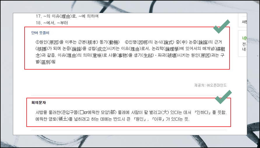 저는 '인할 인'이라는 한자를 그려보았는데요. 문자를 다 그린 후 옆에 있는 선택지에서 첫 번째 것을 마우스로 클릭해 보았어요. 그 결과 검색창에 '인할 인'이 입력되었는데요. 이 상태에서 돋보기 버튼을 클릭하면 관련 사전적 정보를 살펴볼 수 있어요.