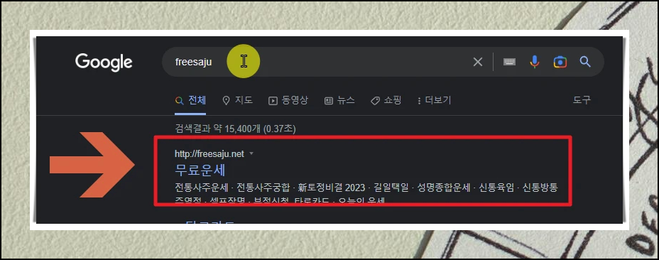 검색을 통해 쉽게 freesaju에 접속이 가능합니다. 안전하게 인터넷 브라우저에 주소를 입력하실 분들은 위 사진을 참고해 주세요.