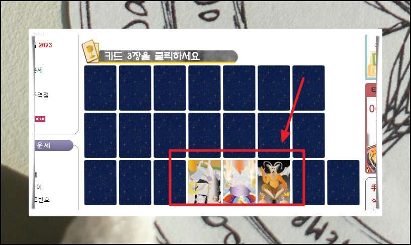 이 사이트에서는 오늘 나의 하루가 어떻게 될 지에 대해 알려주는 운세 서비스를 제공하고 있습니다. 여기서도 마음을 가다듬고, 문제에 집중한 상태에서 한 장을 선택해 주세요.