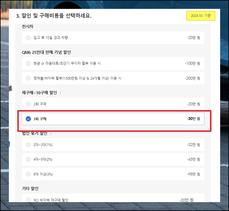 세 번째는 할인 및 구매비용에 대한 것인데요. 다른 말로는 판매조건이라고도 합니다. 해당 사이트에서는 르노삼성자동차에서 제시하는 판매조건을 매달마다 업데이트합니다. 그렇기 때문에 정확한 신차가격표 확인을 하기에 도움이 돼요. 재구매를 하거나 전시차를 구매하면 좀 더 저렴하게 차량 구매가 가능합니다.
