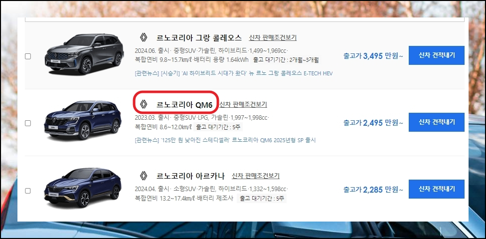제가 주로 이용하는 차량 정보 사이트에서는 이렇게 풍부한 정보를 제공하고 있습니다. 세부모델에 따른 신차가격표는 물론이고, 사양, 제원, 관련 이미지 및 동영상, 시승기, 뉴스 등 관심 있는 르노삼성자동차에 대해 알아보기에 정말 좋은데요. 특히 차량 구매를 할 때 얼마의 금액이 필요한지 알아보고 싶을 때 유용합니다.