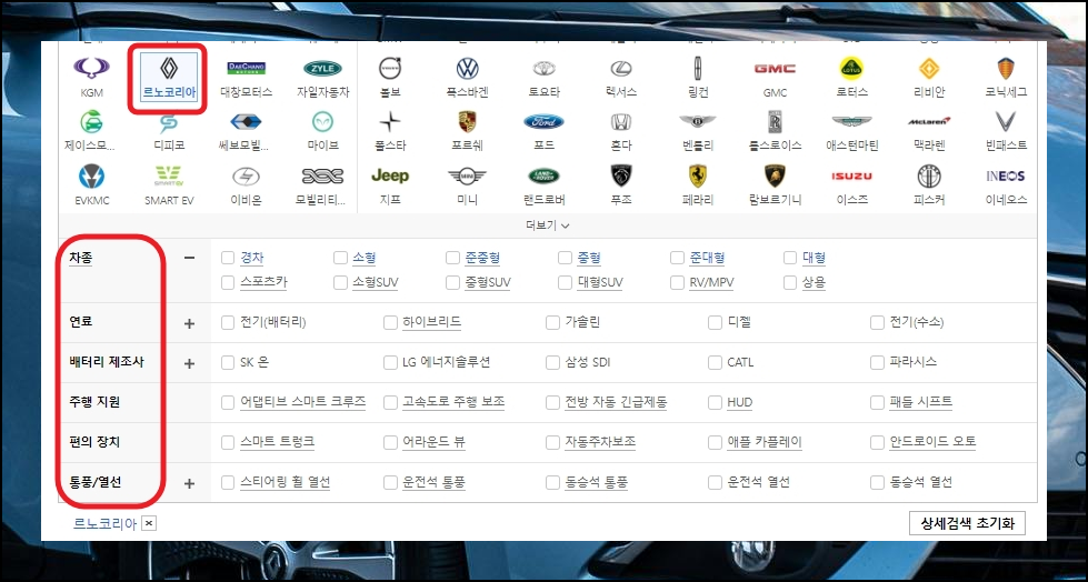 르노코리아 선택을 하면 이렇게 새로운 페이지가 열리면서 몇 가지 선택을 할 수 있도록 되어 있는데요. 여기에서 자신이 원하는 차량 조건을 선택해 주세요. 차종, 연료 타입, 배터리 제조사, 통풍 및 열선 여부 등 다양한 선택이 가능합니다. 이렇게 선택하면 이를 충족하는 르노삼성자동차 모델을 쉽게 찾을 수 있어요.
