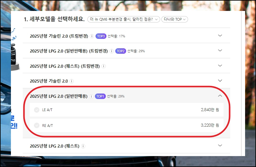 이제부터 4가지 단계를 거치면 르노삼성자동차를 구매할 때 정확히 얼마의 금액을 준비하면 되는지 알 수 있습니다. 1분 내에 선택할 수 있어서 번거롭지 않아요. 가장 먼저 세부모델을 선택해야 하는데요. TOP 표시를 통해 어떤 것이 인기가 가장 많은지 쉽게 파악이 가능합니다.
