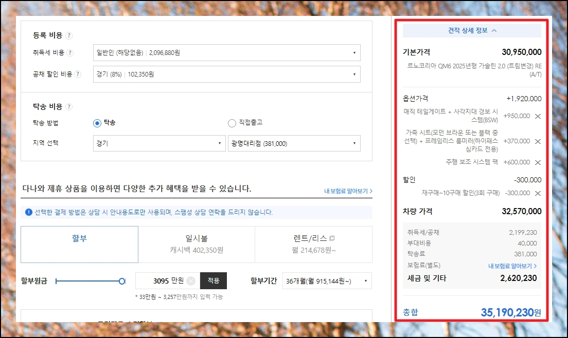 이것을 통해 QM6, XM3 등 다양한 모델의 세부 등급부터 옵션, 판매 조건까지 모든 요소를 고려한 정확한 금액 정보를 얻을 수 있습니다. 또한 다른 구매자들의 선호도도 함께 확인할 수 있어, 더욱 현명한 선택에 도움이 됩니다. 그럼 같이 알아보시죠.