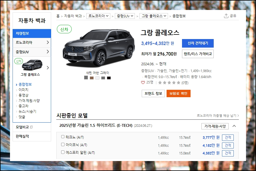 제가 주로 이용하는 차량 정보 사이트에서는 이렇게 풍부한 정보를 제공하고 있습니다. 세부모델에 따른 신차가격표는 물론이고, 사양, 제원, 관련 이미지 및 동영상, 시승기, 뉴스 등 관심 있는 르노삼성자동차에 대해 알아보기에 정말 좋은데요. 특히 차량 구매를 할 때 얼마의 금액이 필요한지 알아보고 싶을 때 유용합니다.