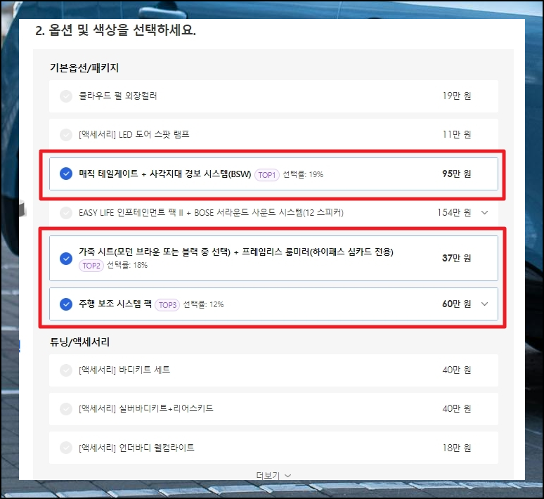 두 번째는 옵션색상을 선택할 차례에요. 이 경우에도 TOP 표시가 되어 있습니다. 옵션 금액 옆에 보면 화살표가 있는데요. 해당 아이콘을 클릭해 보세요. 그럼 해당 옵션이 어떠한 기능을 하는지 설명이 나옵니다.