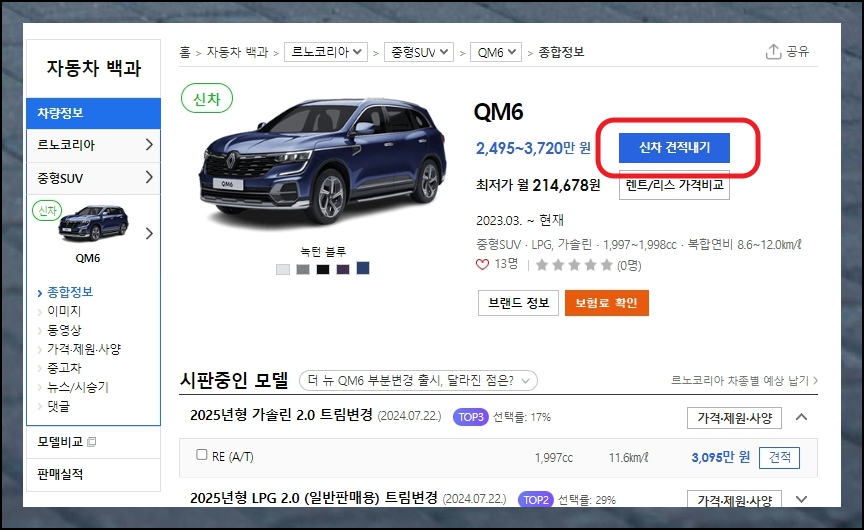 앞서 보여드린 자동차 백과 페이지가 열렸는데요. 여기에서 [신차 견적내기] 버튼을 눌러주세요.