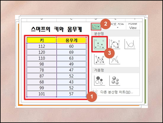 데이터가 준비되었다면, 먼저 표 전체를 드래그해주세요. 그 다음에는 "차트" 메뉴로 이동하셔서 분산형 그래프를 선택하시면 됩니다. 여러 점들이 흩어져 있는 형태의 차트가 바로 그것이에요.