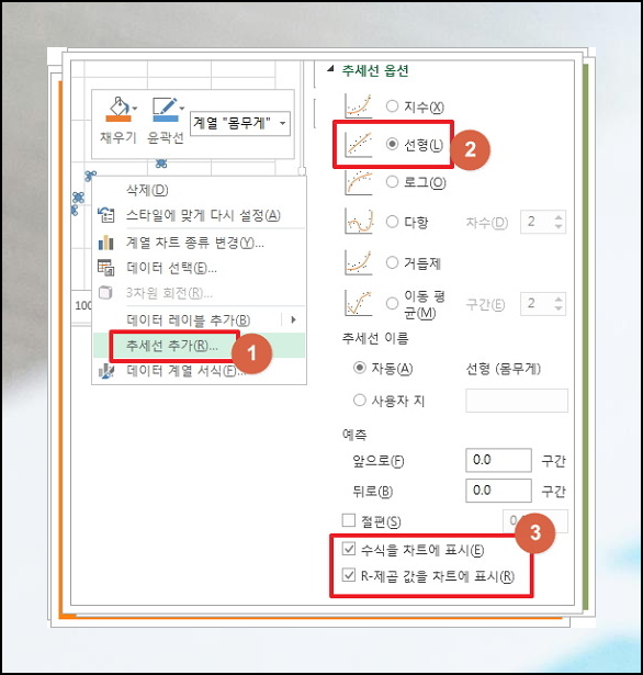 이제 그래프에 있는 점들을 우클릭해볼까요? '추세선 추가'라는 옵션이 보일 거예요. 여기서 "선형"을 선택하고, "수식 표시"와 "R-제곱 값"을 체크해주세요. 이렇게 하면 멋진 회귀분석 그래프가 완성됩니다.