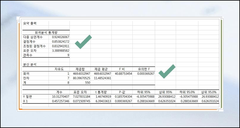 더 자세한 결과를 얻길 원한다면, [분석] - [데이터 분석] - [회귀분석] 순서로 클릭해주세요. 만약 제가 언급한 메뉴가 보이지 않는다면, "Excel 옵션"에서 "추가기능" 부분을 확인하시고 해당 데이터 관련 도구를 추가해주셔야 합니다.