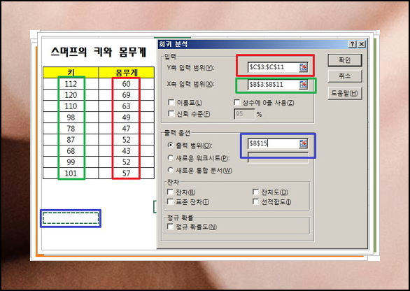 이제 각각의 변수를 지정할 차례입니다. "종속변수"는 빨간색으로, "독립변수"는 녹색으로 표시된 범위를 지정해주세요.