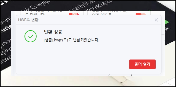 변환 작업이 완료되면 성공 메시지와 함께 새로운 창이 나타납니다. 열기 버튼을 누르면 방금 만든 한글파일로로 바로 확인할 수 있으니 편리하죠. 변환된 문서는 원본의 품질을 최대한 보존하면서도 한글파일로 진행하는 편집에서 자유롭게 편집할 수 있어 업무 효율을 크게 높여줄 거예요.