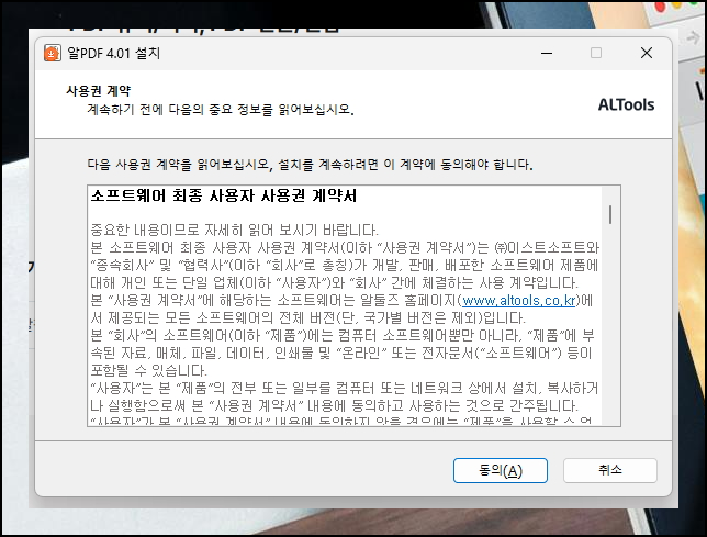 프로그램 설치 과정은 매우 단순합니다. 화면에 나타나는 동의와 다음 버튼만 차례로 클릭하시면 되니까요. 복잡한 설정이나 어려운 선택 없이 기본값으로 진행해도 충분히 원활한 사용이 가능해요.