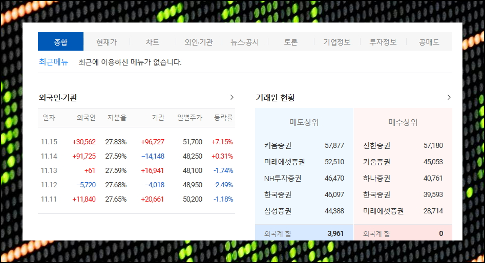 개별 종목명을 누르면 해당 주식의 시세는 물론 투자 관련 정보와 뉴스, 공시자료, 외국인과 기관의 거래 비중, 다양한 차트까지 볼 수 있어요. 다음 증권은 이러한 정보를 한눈에 보기 쉽게 정리해서 보여줍니다.