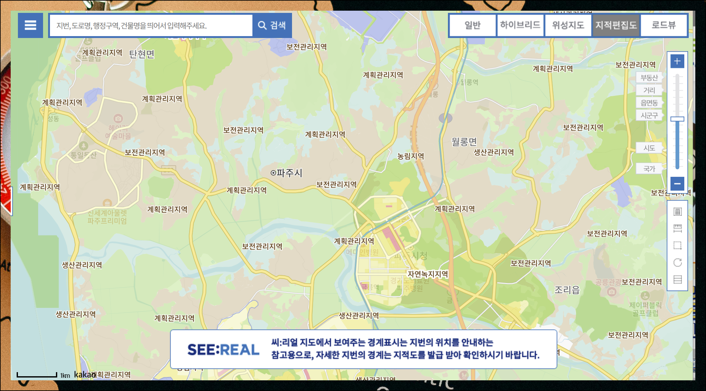 지도 화면 우측 상단에는 일반부터 로드뷰까지 총 다섯 가지 지도 유형이 준비되어 있습니다. 목적에 맞는 지도를 선택하면 됩니다. 지적도 보기를 원한다면 해당 메뉴를 클릭하세요.