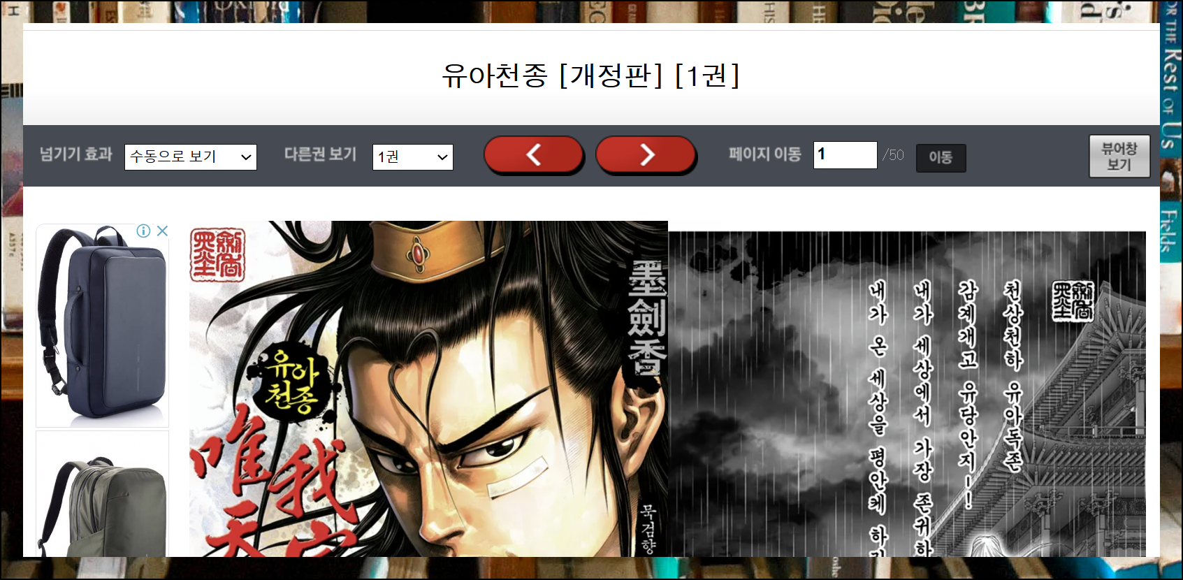 홈페이지에서 원하는 작품의 제목이나 이미지를 클릭하면 뷰어가 실행됩니다. 화살표로 페이지를 넘기거나 자동 넘기기 기능을 사용하면 더욱 편리하게 감상할 수 있어요. 확대 축소도 자유롭게 가능하니 편하게 보세요.