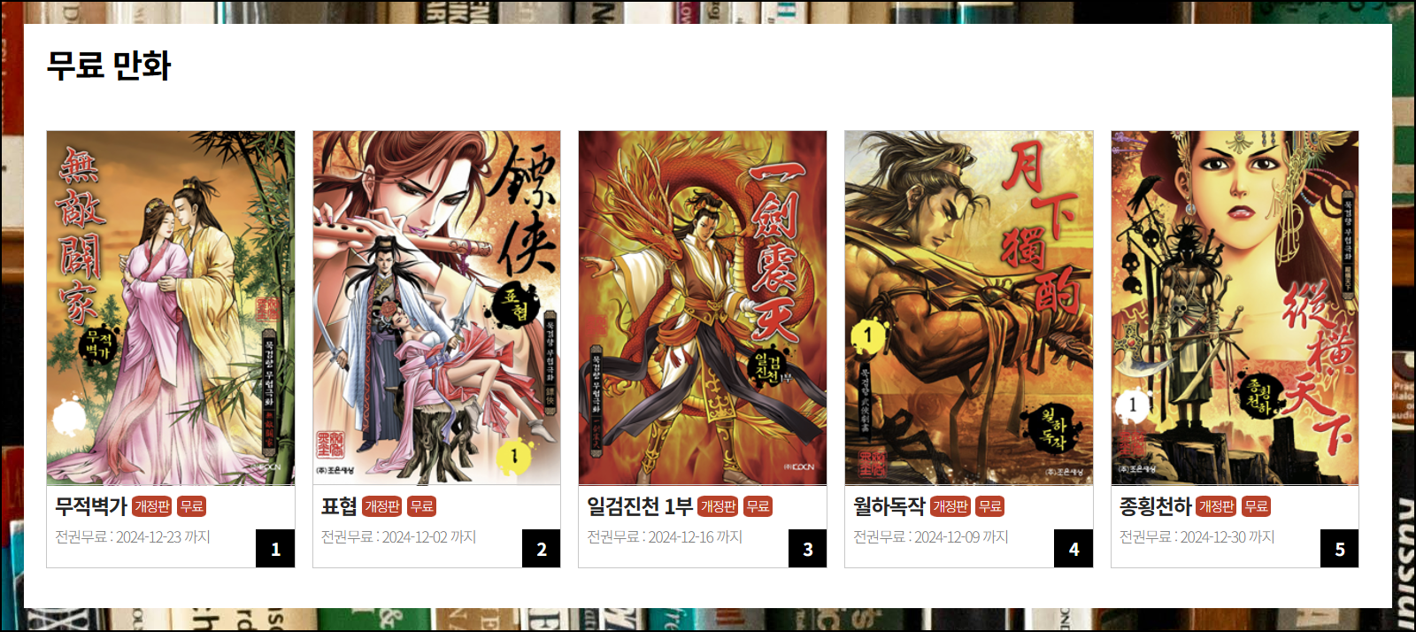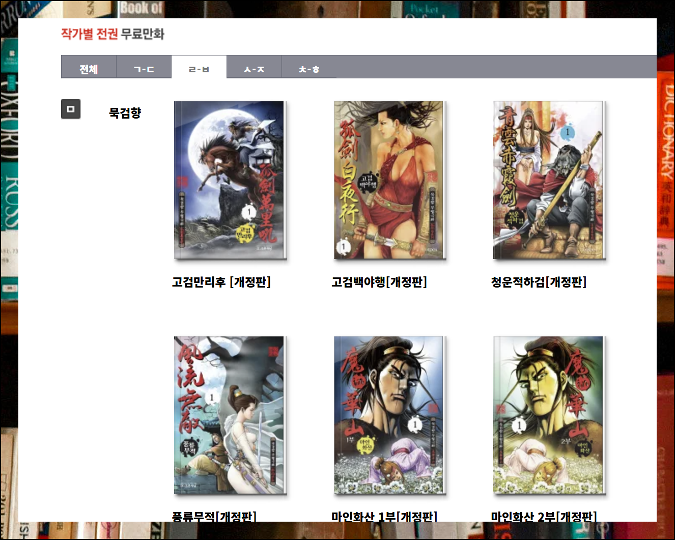 홈페이지 상단의 무료 만화 메뉴를 클릭하면 됩니다. 산둥악가부터 살수까지 묵검향의 다양한 작품이 준비되어 있죠. 회원 가입 없이도 바로 감상이 가능해요.