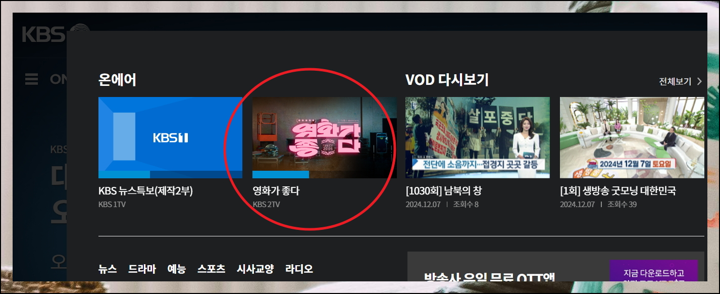 홈페이지 좌측 상단의 전체 메뉴에서 온에어 카테고리를 선택하면 kbs2 방송보기가 가능합니다. KBS1과 KBS2 채널을 쉽게 골라볼 수 있어요.
