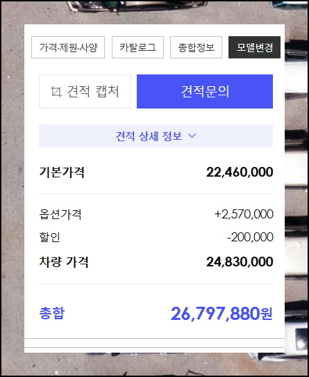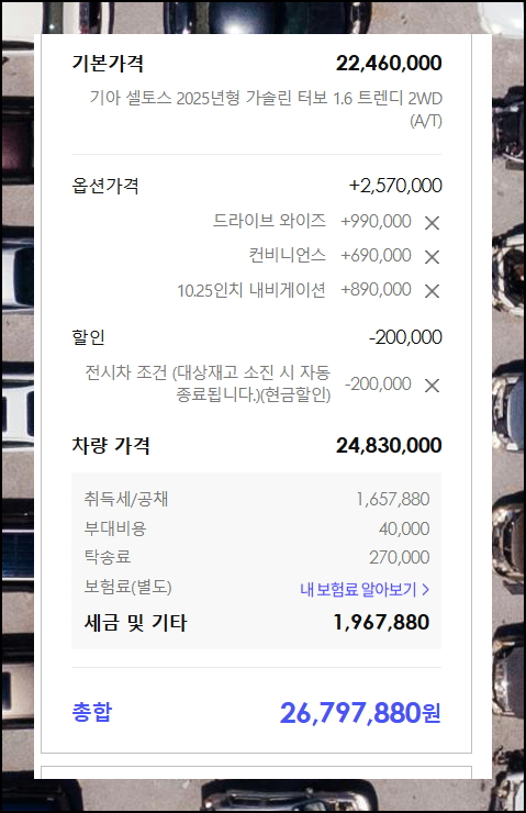 기아자동차 셀토스 가격표에서 세금과 기타 비용 정보를 입력하면 실제 대리점 견적과 거의 동일한 최종 가격이 표시됩니다. 이를 통해 실제 구매 비용을 정확하게 파악할 수 있어요.