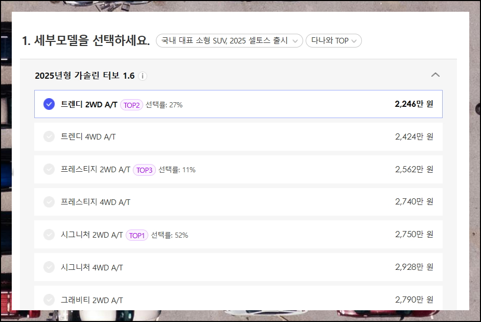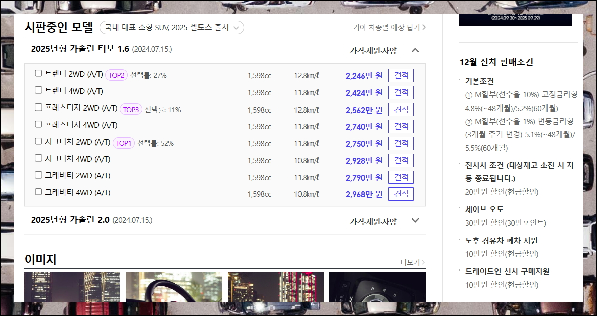 아직 결정을 못했다면 기아자동차 셀토스의 인기 있는 상위 3개 모델을 참고하면 도움이 됩니다. 많은 소비자들이 선택한 이유를 확인할 수 있어요.