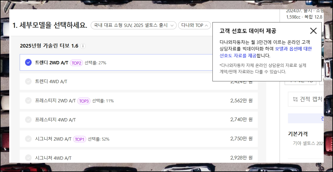 다나와 자동차 사이트를 방문하면 셀토스 가격표를 무료로 확인할 수 있습니다. 회원가입 없이도 바로 이용 가능한 시스템이에요. 누구나 쉽게 접근할 수 있는 장점이 있습니다.