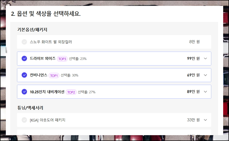 기본옵션부터 패키지, 튜닝, 액세서리까지 다양한 옵션을 선택할 수 있어요. 가격표에서 각 옵션의 자세한 설명도 확인 가능합니다. 원하는 기능을 꼼꼼히 살펴보세요.