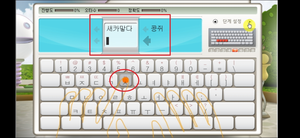 ▼각 연습 영역에서 단계를 변경하는 것도 가능합니다. 자판에서 다른 위치에 있는 부분을 연습하거나 다른 글로 연습하고 싶을 때 우측 상단에 있는 [단계 설정] 옆에 있는 화살표 버튼을 클릭하면 됩니다.