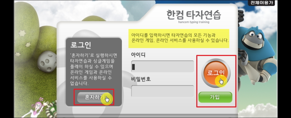 ▼소프트웨어 설치하기 끝난 후에 바탕화면을 보면 한글과 컴퓨터 타자연습 바로가기 아이콘이 생성되어 있을 겁니다. 해당 아이콘을 더블 클릭하여 자판연습 프로그램을 실행합니다. 맨 처음 실행하면 혼자하기와 로그인 이렇게 2가지 중 하나를 선택해야 합니다. 안내 문구를 읽어보고, 본인에게 맞는 것을 선택하면 됩니다. 저는 "혼자하기"를 주로 이용합니다.