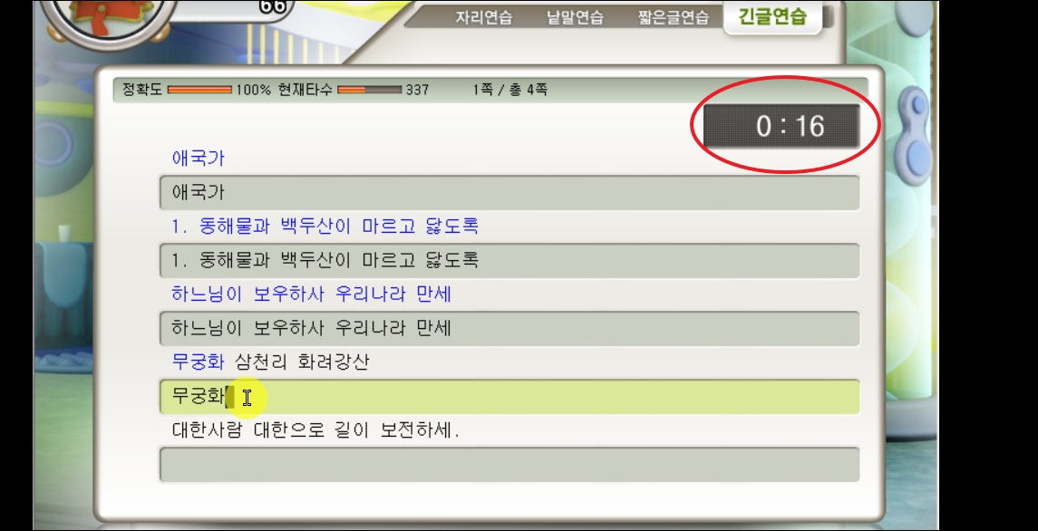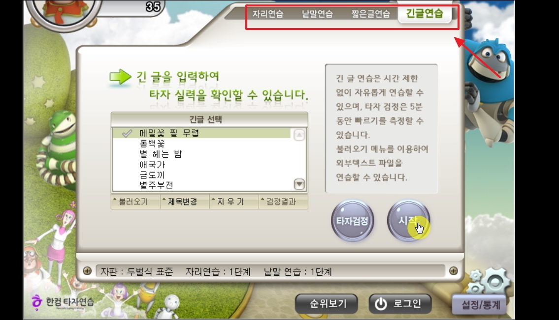 ▼해당 프로그램을 통해 연습할 수 있는 부분은 자리, 낱말, 짧은글, 긴글 이렇게 4가지 입니다. 실력에 맞게 좌측에서부터 순서대로 익히면 됩니다.