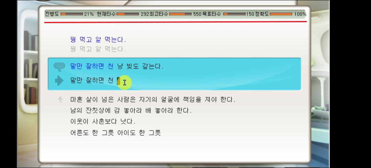 ▼어느 정도 실력이 올라가면 자판연습을 넘어 짧은 글을 입력하는 연습으로 넘어가면 됩니다. 이때부터 타자 치는 재미가 있습니다. 내가 연습한 이력을 바탕으로 진행도, 현재타수, 정확도, 최고타수가 실시간으로 표시됩니다.