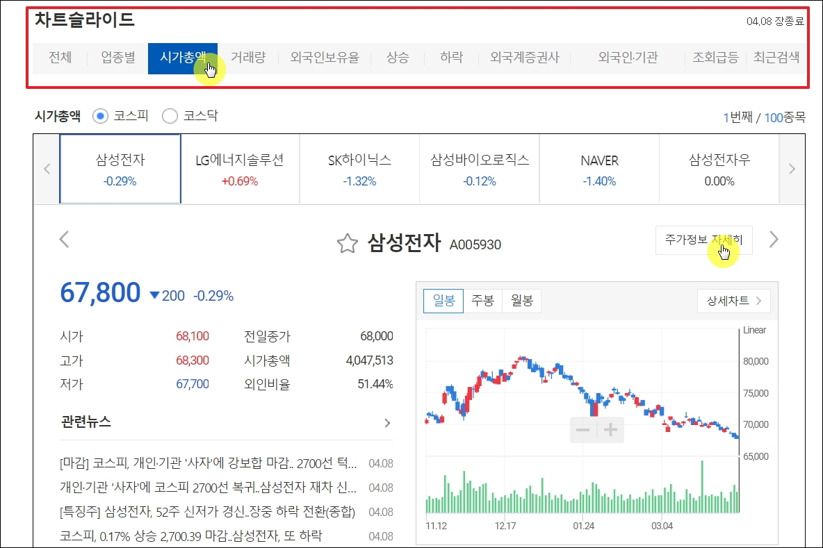 ▼차트슬라이드는 업종별 외에도 시가총액, 거래량, 외국인보유율, 상승, 하락 등 여러 기준으로 돌려보는 것이 가능합니다. 시가총액을 선택하면 시가총액이 가장 높은 순으로 주식 종목을 살펴볼 수 있습니다. 해당 주식에 대한 깊이 있는 정보를 얻길 원한다면 [주가정보 자세히] 버튼을 클릭하면 됩니다.