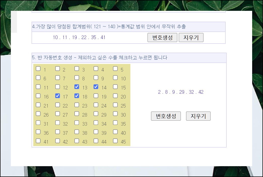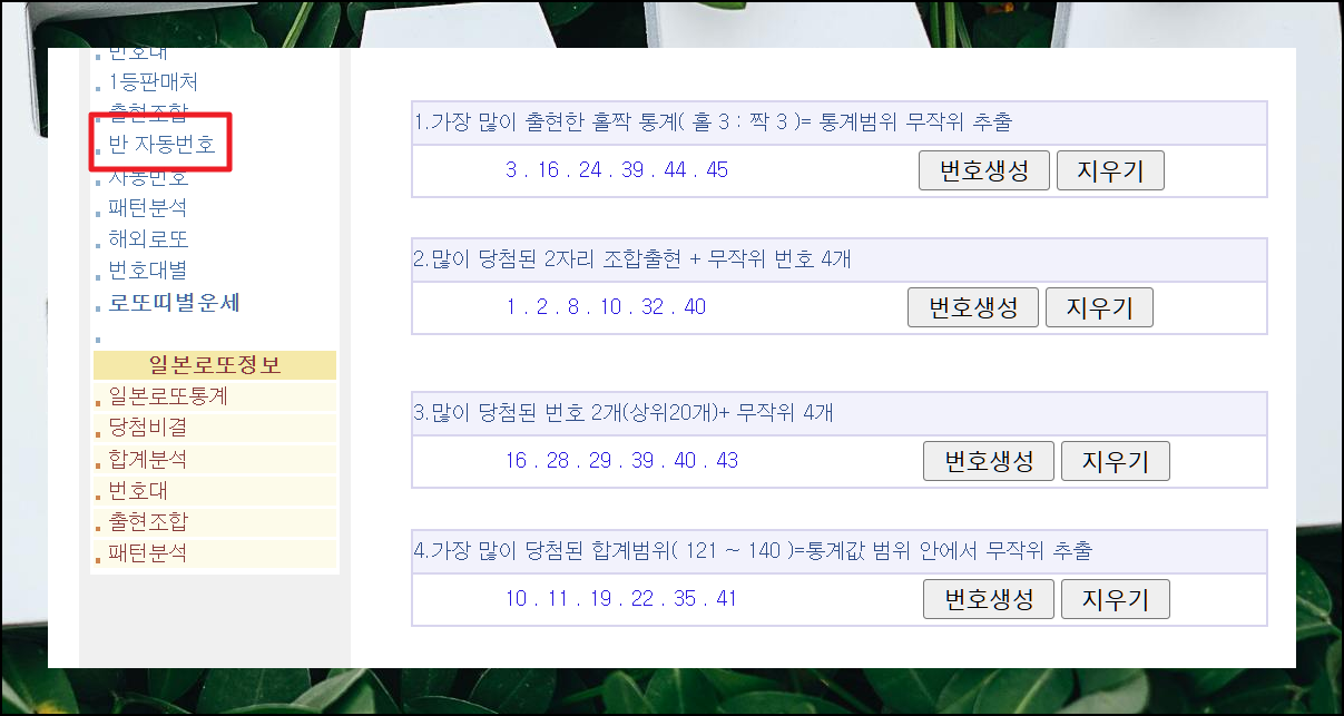 특정 숫자를 피하고 싶다면 5번째 반자동 생성기를 이용하세요. 사용하기 싫은 숫자에 체크하고 번호생성 버튼을 누르기만 하면 돼요. 여러분의 취향에 맞는 로또 번호를 무료로 받아보세요.
