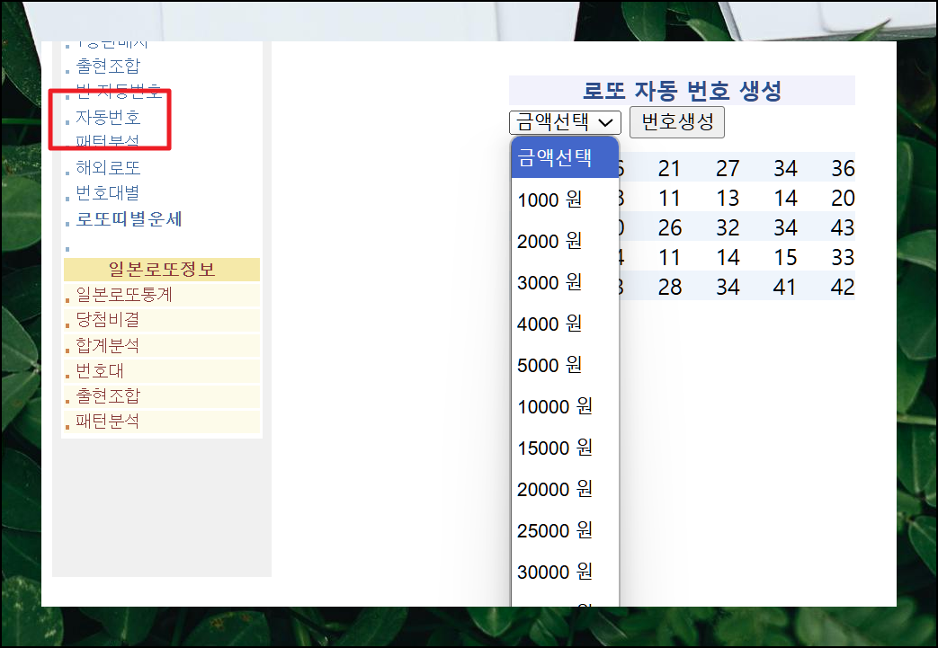 새로운 화면에서는 자동번호 메뉴를 선택해주세요. 원하는 구매 금액을 입력하고 [생성] 버튼을 눌러보세요. 금액에 맞춰 로또 복권을 구매할 때 사용할 수 있는 숫자를 무료로 받아볼 수 있습니다. 마음에 드는 숫자가 나올 때까지 여러 번 생성해도 괜찮아요.