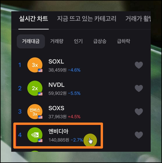 메뉴에서는 여러 투자 상품을 한눈에 볼 수 있어요. 해외주식을 선택하면 거래대금, 거래량 등 5가지 기준으로 정렬된 종목들을 확인할 수 있습니다. 이를 통해 자신에게 맞는 투자 종목을 찾아보세요. 해외주식 매매 시작 전에 충분한 정보 수집이 중요해요.