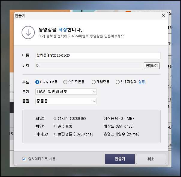 영상의 제목과 저장 위치를 정하고 용도에 맞는 크기와 품질을 선택하세요. 만들기 버튼으로 작업을 마무리합니다.