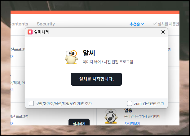 알씨 동영상 프로그램 설치하는 중에 추가 프로그램 설치 옵션이 나타날 수 있어요. 필요한 프로그램만 선택하고 나머지는 체크를 해제하세요.