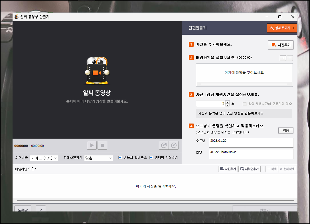 멋진 동영상을 만들기 위해 음악과 사진 파일을 미리 준비해주세요. 그 다음 윈도우 시작 버튼을 눌러 "알씨 동영상 만들기"를 입력합니다. 그럼 쉽게 해당 소프트웨어를 찾을 수 있어요. 동영상 제작 프로그램이 실행되면 제작에 이용되는 파일을 추가하고 재생 시간을 조절하면 영상이 완성됩니다.